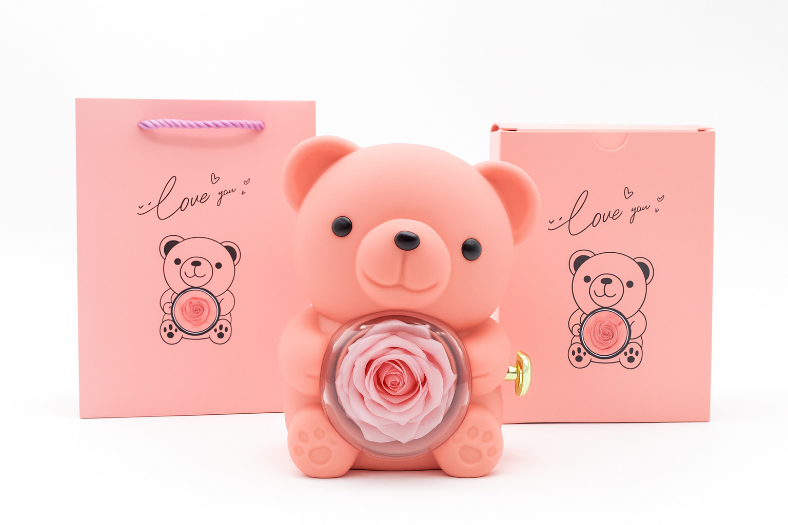 Solo abre la tapa y activa el mecanismo para que el oso gire suavemente mostrando la rosa. La flor eterna está diseñada para mantenerse intacta durante años, sin necesidad de agua o cuidados. Es un regalo listo para entregar, que combina ternura y romanticismo en un solo detalle.